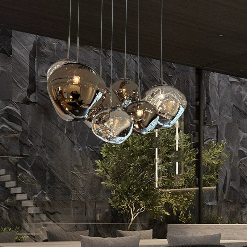 Mit Aurelia setzen Sie ein stilvolles Statement in Ihrem Zuhause. Diese edle Glas-Hängeleuchte vereint nordischen Light-Luxury-Stil mit postmoderner Schlichtheit und beeindruckt durch ihre unregelmäßige, von Lava inspirierte Form. Erhältlich in den Farben Gold, Silber und Weinrot, sorgt Aurelia für ein elegantes, stimmungsvolles Licht – perfekt für Wohn- und Essbereiche, Schlafzimmer oder repräsentative Eingänge.