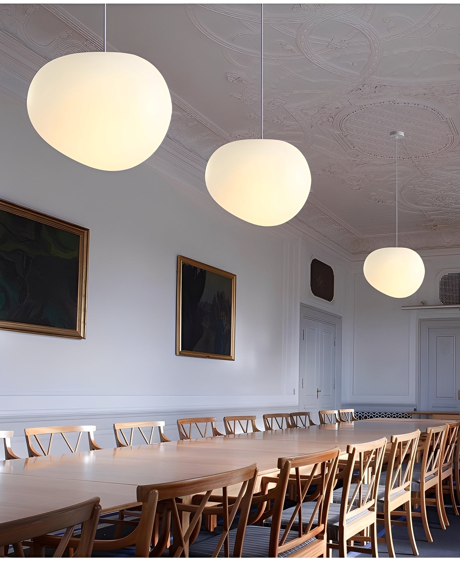 Die Nayla Pendelleuchte überzeugt mit ihrem modernen Kieselstein-Design in Milchweiß. Sie eignet sich ideal für Restaurants, Schaufenster oder als stilvolles Highlight in Wohnräumen und sorgt für eine helle, angenehme Ausleuchtung.