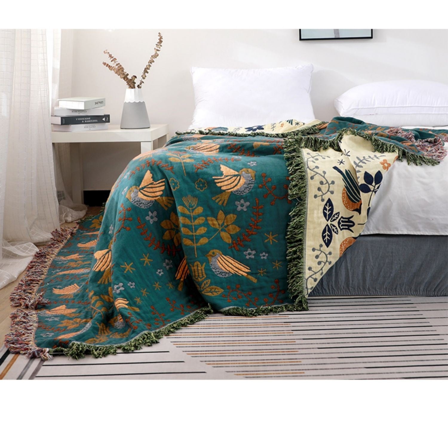 Die Sarah Reine Baumwollgaze Decke bringt frischen Komfort in Ihr Zuhause. Hergestellt aus 100% Baumwolle, bietet diese Decke eine weiche und atmungsaktive Textur, die sich perfekt für den Frühling und Sommer eignet. Mit ihrem eleganten Landschaftsmuster und den sanften Farben Spring Bird-Green und Spring Bird-Blue fügt sie sich harmonisch in jedes Schlafzimmer oder Wohnzimmer ein.