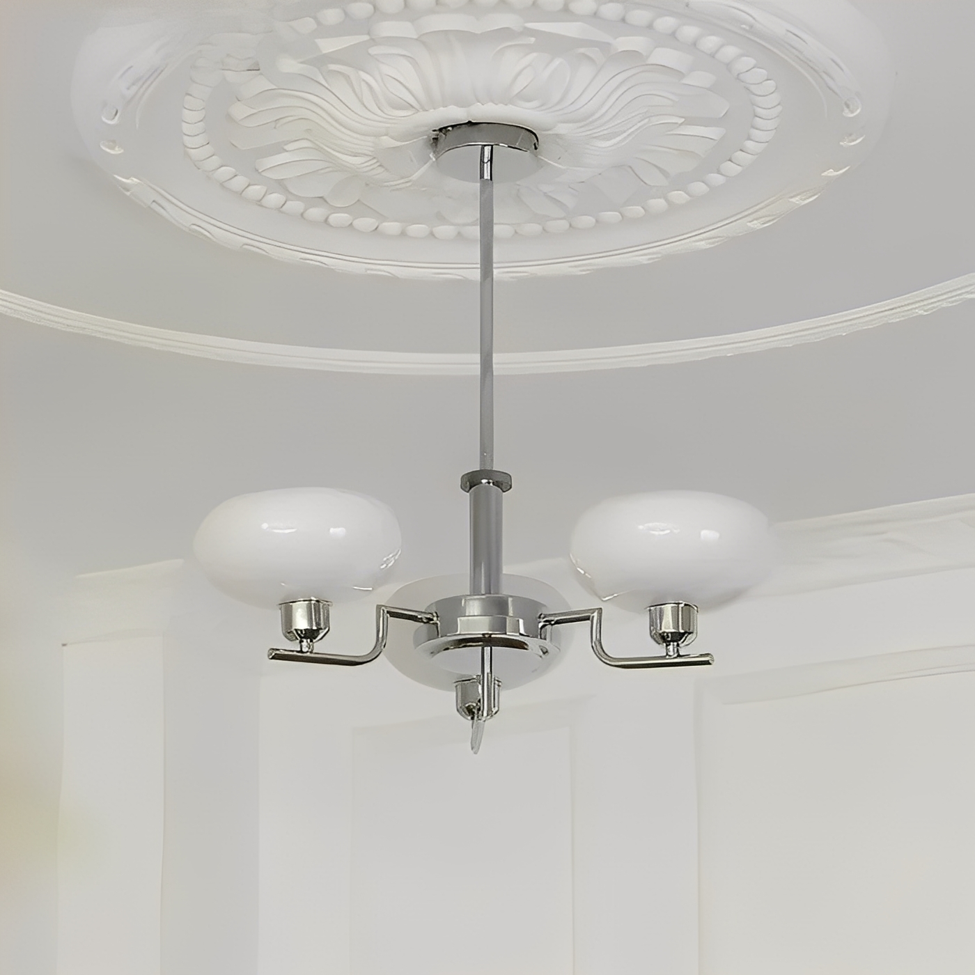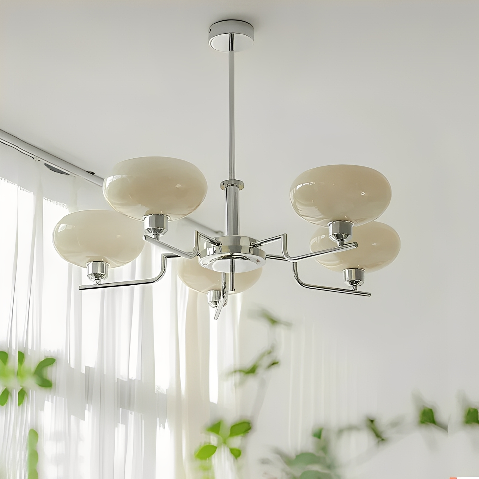 Der Selva Kronleuchter vereint den charmanten Retro Cream Style mit moderner Schlichtheit. Mit seinen eleganten Glasschirmen und der klaren Formensprache bringt er stilvolle Beleuchtung in Wohn- und Schlafzimmer.